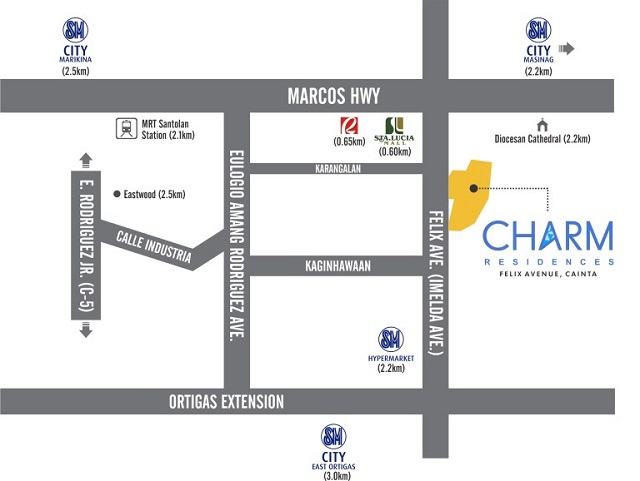 Situated along Felix Avenue (Formerly Imelda Avenue) near Karangalan Road and just a few minutes away from Marcos Highway, Charm Residences provides easy access to the Metro and offers the best hotel-like amenities in the East.
